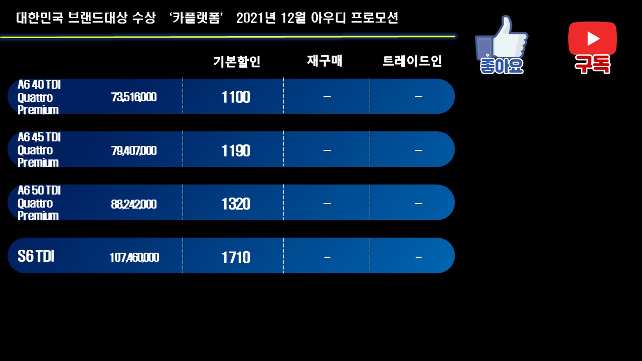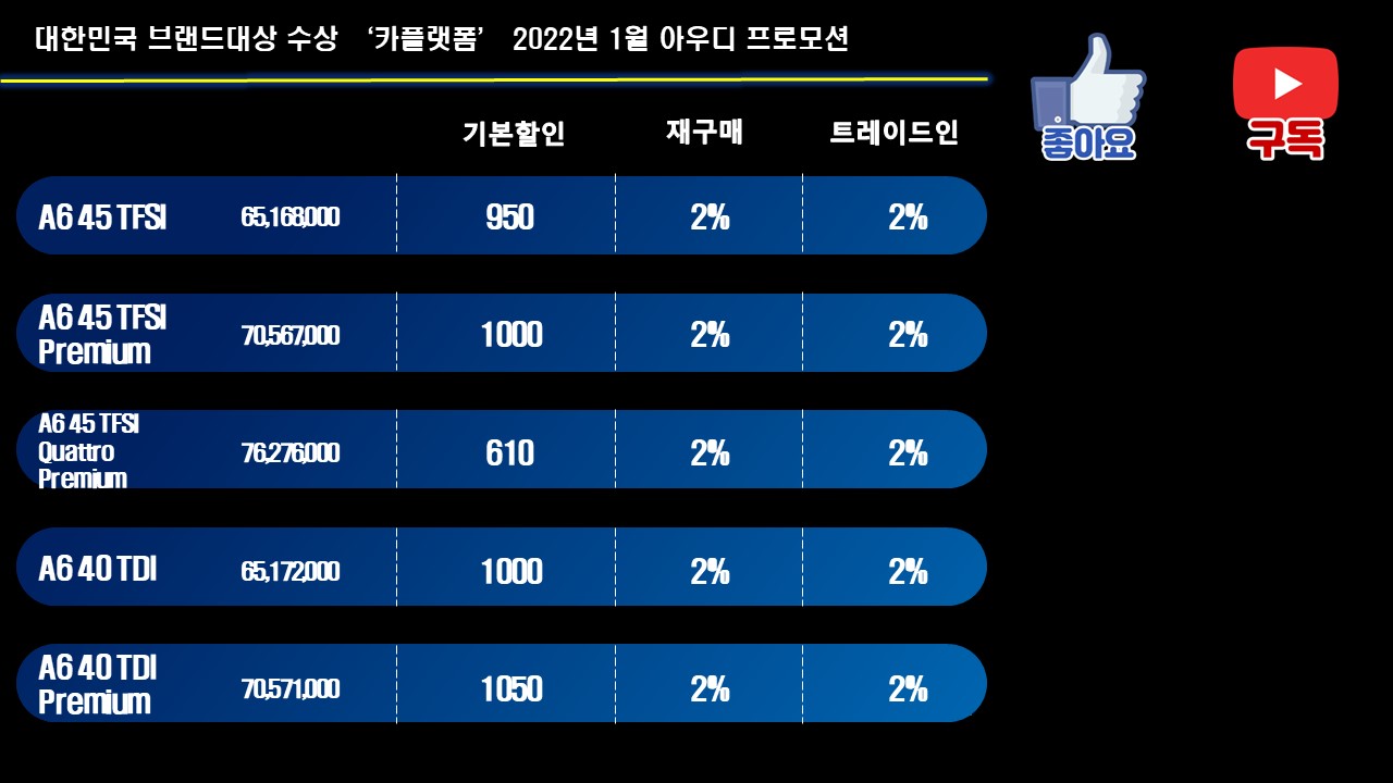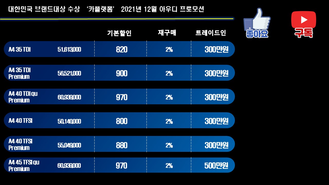 요즘 처럼 길거리에 사람들 모습을 보기 힘들때가 있을까 싶을 정도로 코로나19의 영향과 한파의 영향력이 장난이 아니네요 저 또한 집 차 회사의 패턴으로 열심히 코로나19와 한파를 피하고 있습니다. 나이가 점점 들다보니 드문드문 친구들 만나는게 낙이 었는데 요즘은 어디서 얼굴좀 보자해도 진짜 말뿐인 것같아 마음 한켠이 씁쓸해 지는건 어쩔 수 없나봅니다. 예전으로 돌아가는 날이 오겠죠?ㅎ 12월에 이어 2022년 1월에도 꾸준히 추진하고 있는 수입차 프로모션에 대한 포스팅을 오늘도 진행해 보고자 합니다. 장기렌트카/자동차리스 비교견적 전문기업인 카플랫폼과 함께 하고 있습니다. 변동이 심한 수입차 시장에서 저 혼자서는 자료를 수집하기에는 아우디 브랜드 내에서도 너무 많은 딜러사가 있기 때문에 불가능에 가까워서 직접 알아보는 정보와 카플랫폼에서 제공해 주는 정보를 수집하여 팩트체크 후 포스팅을 하기 때문에 그 어느때 보다도 질적인 측면에서는 완벽에 가깝다고 자부하고 있습니다. 1월 두번째 주자인 아우디1월프로모션을 살펴보도록 하겠습니다. 아우디 뿐만이 아니라 수입차의 경우에는 매달 바뀌는 할인 즉 프로모션이 가장 중요한 포인트이기 때문에 정보력 싸움이 치열합니다. 재고, 할인, 금융에 따라 소비자 입장에서도 올바른 기준을 세울 수 있기 때문입니다.차량 구매 전 꼭! 제 포스팅을 정독하시고 구매하신다면 최소한 바가지 썼네! 라는 말은 듣지 않게 해드릴 수 있습니다.