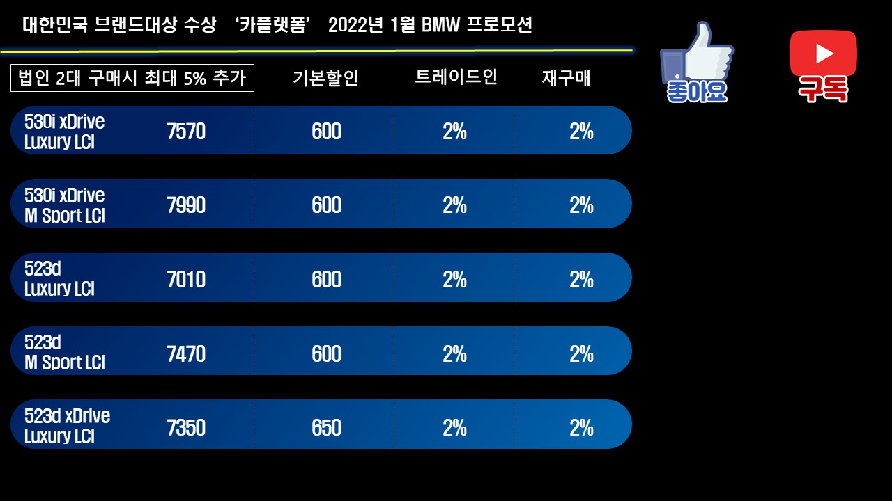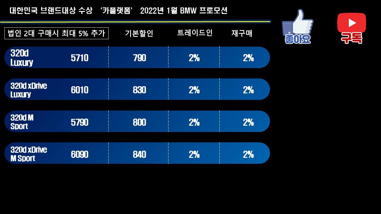 BMW프로모션 BMW할인 BMW1월프로모션 BMW1월할인을 깔끔하게 정리하여 드렸습니다. 작성한 포스팅은 작성일 기준이기 때문에 재고가 빠지거나 할인 금액에 변동이 생길 수도 있습니다. BMW의 가장 큰 이슈를 꼽자면 주력 모델들의 다운그레이드 소식과 그로 인한 차량가 변경소식입니다.