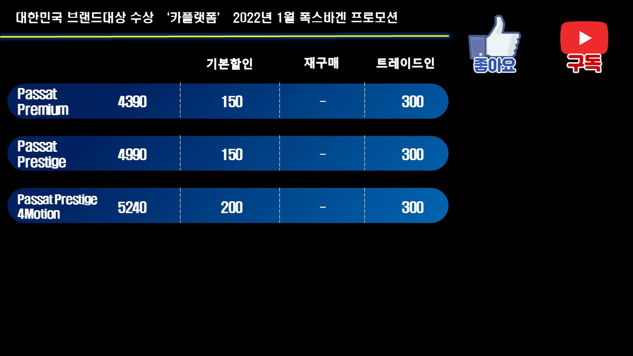 연일 강추위에 아무리 껴입어도 밖에 나갈때면 다시 발걸음을 돌려 온수매트 위로 올라가고 싶은 마음이 굴뚝같은 하루하루 입니다. 채욘이는 감기에 걸려 병원에 주기적으로 다니고 있는데 아직 기침을 하는 모습을 보니 안쓰럽기도 하고 말안들을때는 열받기도 하고, 다양한 감정이 복합적으로 드네요. 12월에 이어 22년 1월에도 꾸준히 추진하고 있는 수입차 프로모션에 대한 리뷰를 오늘도 진행해 보고자 합니다. 장기렌트카/자동차리스 비교견적 전문기업인 카플랫폼과 함께 하고 있습니다. 변동이 심한 수입차 시장에서 저 혼자서는 자료를 수집하기에는 폭스바겐 내에서도 너무 많은 딜러사가 있기 때문에 불가능에 가까워서 직접 알아보는 정보와 카플랫폼에서 제공해 주는 정보를 수집하여 팩트체크 후 포스팅을 하기 때문에 그 어느때 보다도 질적인 측면에서는 완벽에 가깝다고 자부하고 있습니다. 1월 첫번째 주자인 폭스바겐1월프로모션을 살펴보도록 하겠습니다. 폭스바겐 뿐만이 아니라 수입차의 경우에는 매달 바뀌는 할인 즉 프로모션이 가장 중요한 포인트이기 때문에 정보력 싸움이 치열합니다. 재고, 할인, 금융에 따라 소비자 입장에서도 올바른 기준을 세울 수 있기 때문입니다. 차량 구매 전 꼭! 제 포스팅을 정독하시고 가시면 최소한 비싸게 주고 샀다는 말은 않듣게 해드릴 수 있습니다.